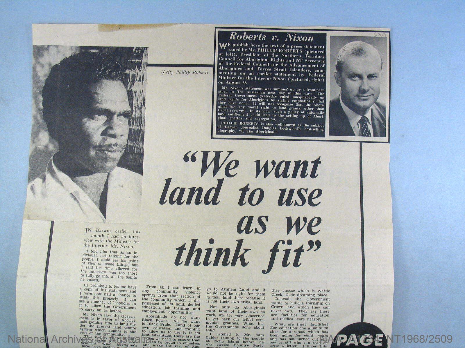 Image credit: Newspaper clipping from 1968, showing Phillip Roberts, President of the NT Council for Aboriginal Rights and NT Secretary of the Federal Council for the Advancement of Aborigines and Torres Strait Islanders, and providing his comments on then Minister for the Interior’s position that Aboriginal people have no land rights. National Archives of Australia A1734, NT1968/25, p114