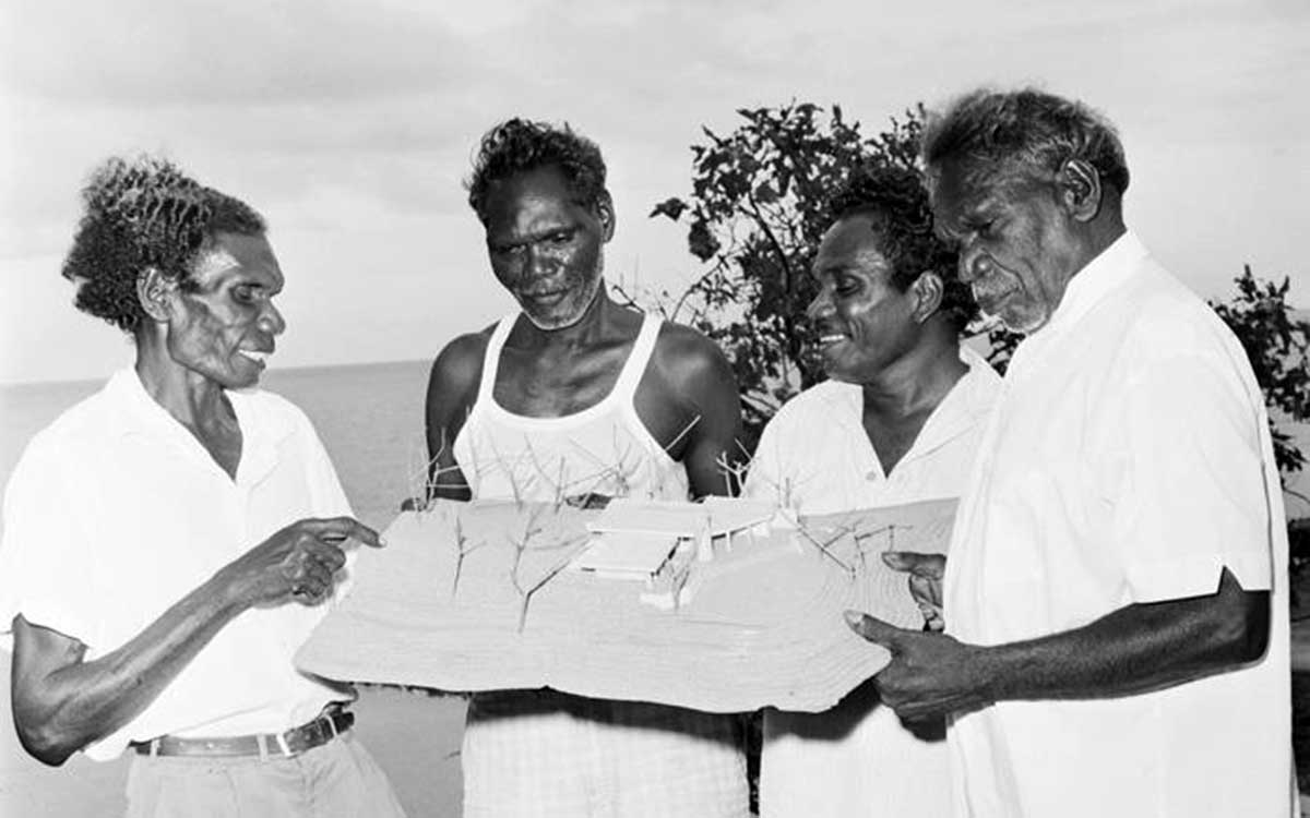 Photo credit: Roy Marika and other Yirrkala councillors discuss a model for ‘Council house’, 1971. National Archives of Australia: A1200, L94074.